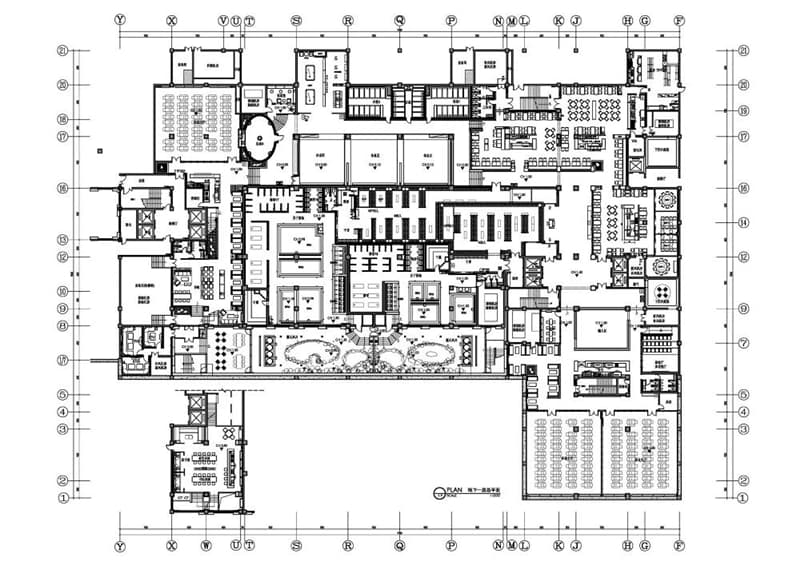 整體業(yè)態(tài)空間的環(huán)境塑造上由儀式感和“水”表情共同完成,木紋鋁格柵的大面積采用不僅締造了大空間的恢弘儀式感和空間氣場,更流溢著自然、生態(tài)的感性視覺。而多種表現(xiàn)手法下的“水”造型,和石材肌理、紋飾即暗示業(yè)態(tài)屬性,又豐富著生機活性的空間表情。