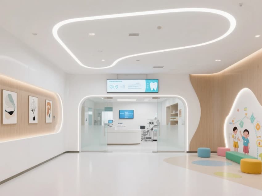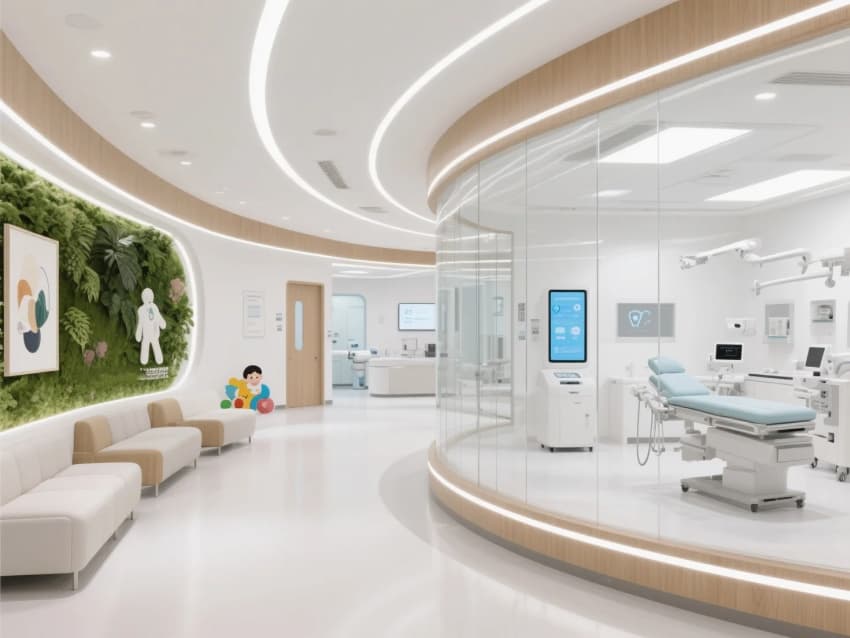 視覺風(fēng)格:純白與木色為主基調(diào),搭配曲線造型燈帶與玻璃隔斷,弱化傳統(tǒng)醫(yī)療空間的冰冷感。
