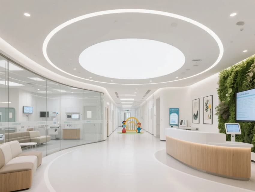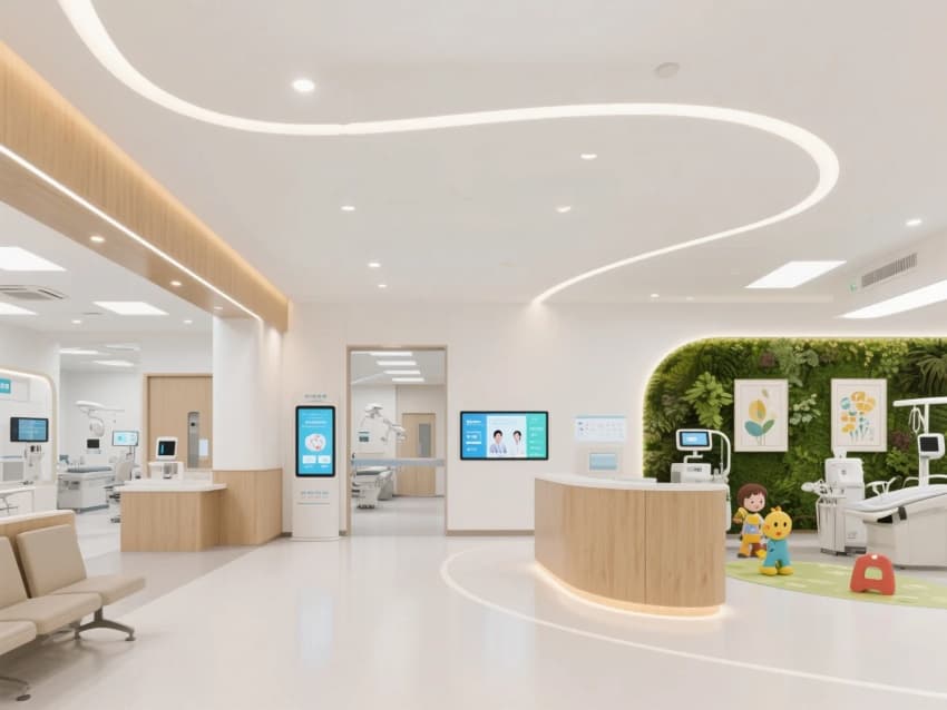 舒緩細(xì)節(jié):綠植墻、藝術(shù)掛畫、兒童趣味互動(dòng)區(qū),緩解患者緊張情緒。