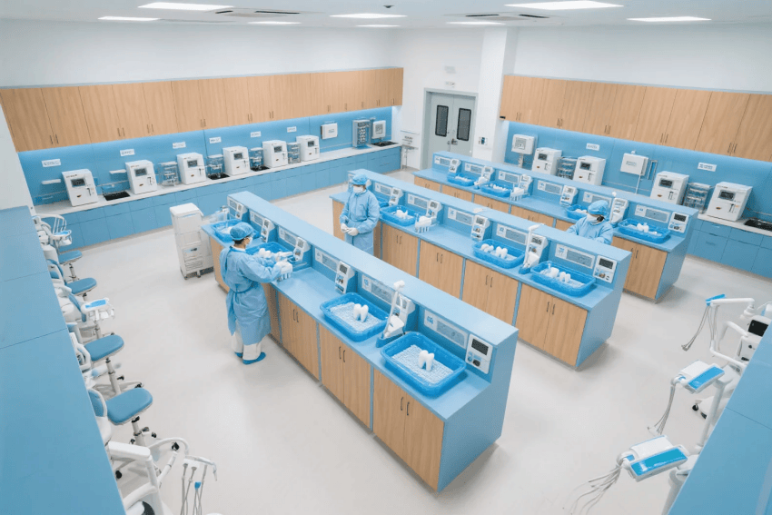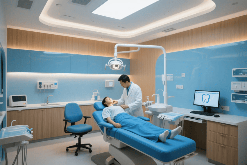本案采用"醫(yī)療空間人文關懷"設計理念,以專業(yè)藍與溫暖木為主色調,打造兼具醫(yī)療專業(yè)度與人文溫度的現(xiàn)代口腔醫(yī)院。空間運用弧形線條軟化傳統(tǒng)醫(yī)療空間的冰冷感,全智能診療系統(tǒng)隱于簡約設計中。兒童區(qū)通過沉浸式主題場景化解就診焦慮,VIP診室融入酒店式服務細節(jié)提升體驗。