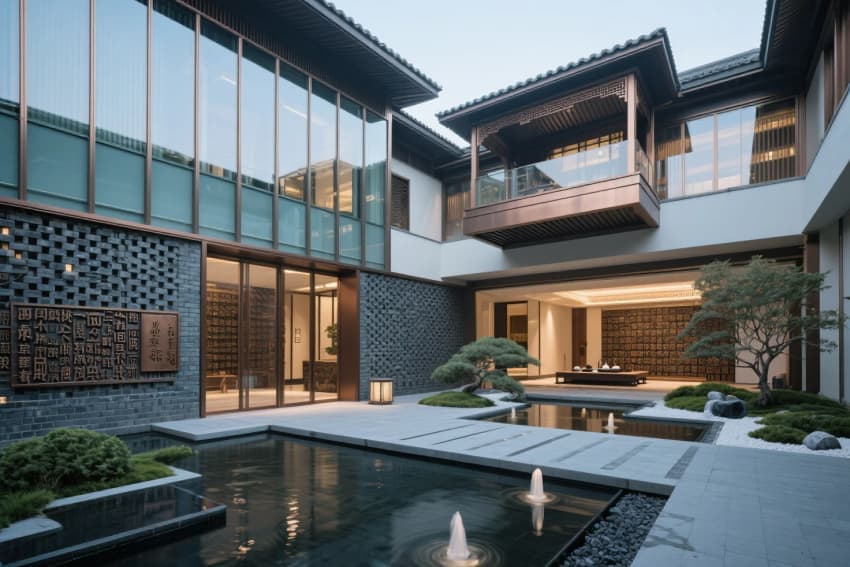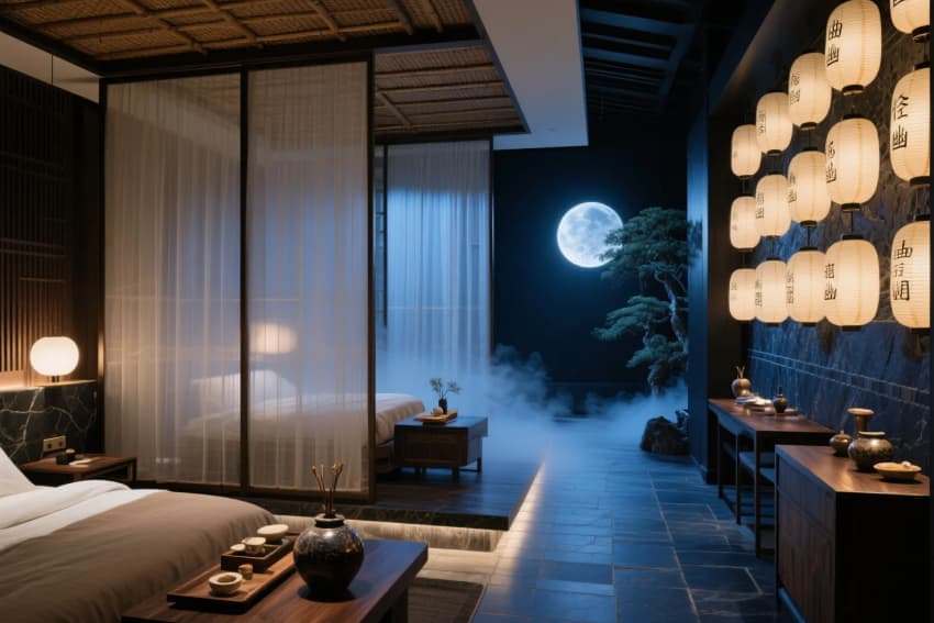 • 設(shè)計以"在地文化與當(dāng)代奢華"的融合為核心理念,打造隱于城市的避世之所。建筑外立面采用青磚鏤空砌筑與銅框玻璃幕墻的古今對話,入口以水景玄關(guān)與活字印刷藝術(shù)墻營造文人雅趣。大堂采用四水歸堂的中庭布局,懸挑茶亭與枯山水庭院構(gòu)成視覺焦點(diǎn)??头客ㄟ^絲絹屏風(fēng)與智能調(diào)光系統(tǒng)實(shí)現(xiàn)場景轉(zhuǎn)換,spa區(qū)引入藥香霧化與聲療系統(tǒng)。材質(zhì)上強(qiáng)調(diào)匠人精神——大漆家具、手工陶磚、竹編天花,搭配納米石材與智能肌膚觸感墻面。夜間的紙燈籠矩陣與月光投影系統(tǒng)重塑"曲徑通幽"的東方美學(xué)體驗(yàn)。