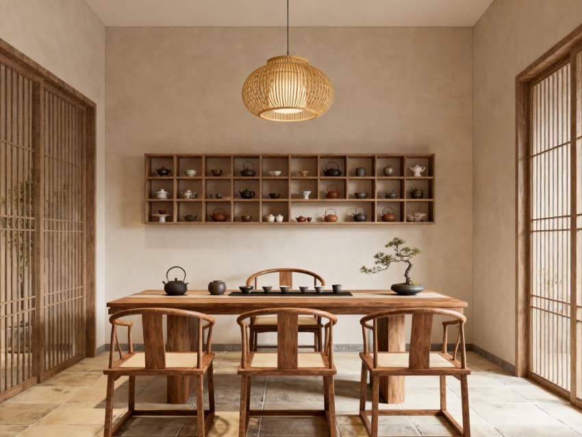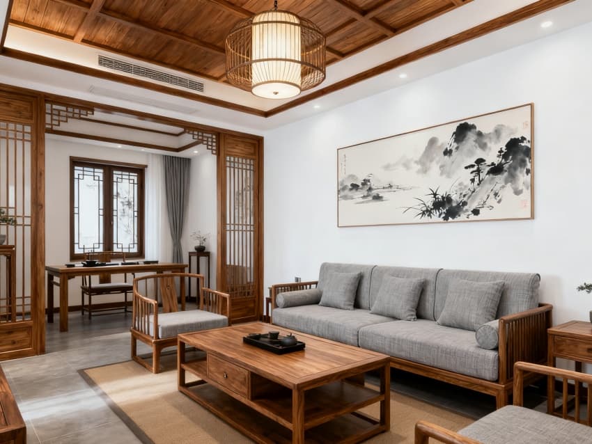 內(nèi)部空間延續(xù)外立面調(diào)性:客廳用深棕實(shí)木家具搭配米白棉麻軟裝,墻面掛水墨風(fēng)格六安山水圖;客房鋪淺木色地板,床品飾藍(lán)白皖西印花,窗邊設(shè)實(shí)木茶臺;餐廳用青石臺面餐桌配竹編餐椅,懸掛木質(zhì)吊燈;茶室露老舊房梁,陳列六安瓜片茶具與粗陶擺件;露臺鋪防腐木,擺藤編桌椅。整體以天然材質(zhì)與地域元素,打造兼具文化感與舒適度的民宿空間。