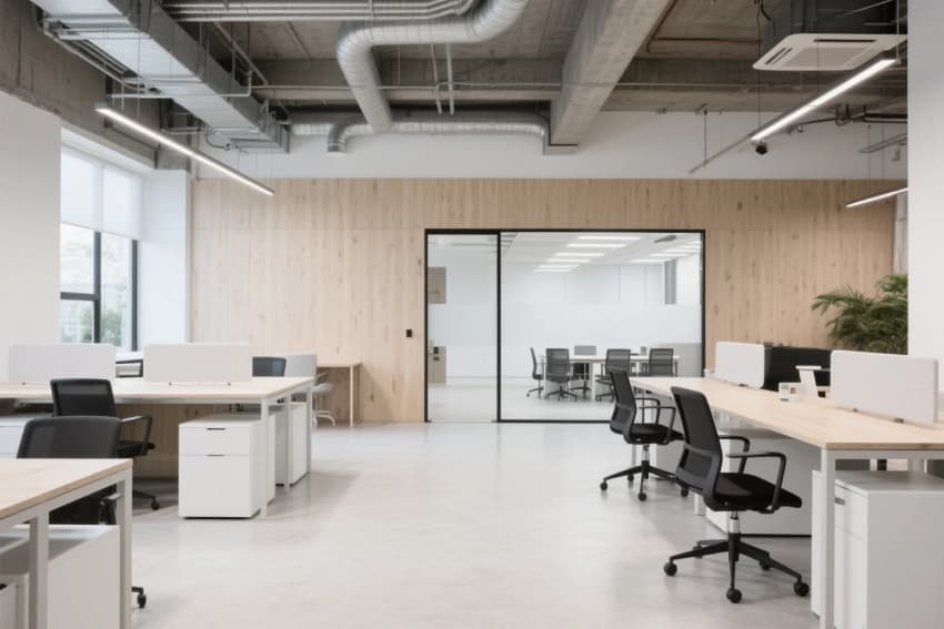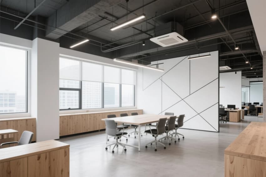 • 工業(yè)風辦公樓設(shè)計,以淺木色橡木地板與白色肌理墻面奠定純凈基調(diào),8米挑高的接待區(qū)采用裸露的鋼結(jié)構(gòu)橫梁,搭配線性垂吊燈具形成幾何構(gòu)圖。開放式辦公區(qū)通過白色穿孔金屬隔斷劃分工位,淺木色集成儲物柜與黑色金屬框架形成材質(zhì)碰撞。休閑區(qū)設(shè)置灰綠色模塊沙發(fā)組合,上方懸挑的木質(zhì)格柵吊頂內(nèi)置暖光漫射光源,與保留的原始混凝土立柱形成冷暖平衡。獨立會議室采用全景霧化玻璃隔斷,內(nèi)部定制白色會議桌搭配黑色工業(yè)風軌道射燈,墻面裝飾的抽象線條實木拼貼呼應(yīng)整體設(shè)計語言。各功能區(qū)域通過地面材質(zhì)的漸變過渡自然銜接,裸露的通風管道與精心設(shè)計的綠植墻共構(gòu)出生機盎然的工業(yè)美學(xué)。