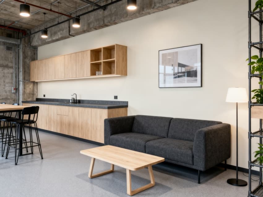 開放式辦公區(qū):地面鋪淺灰亞麻紋地膠,工位為深灰金屬框架+淺木色桌面,搭配黑色辦公椅,隔斷用黑色金屬框架+半透玻璃,天花懸黑色金屬線性燈,立柱做深灰防銹漆處理,墻面掛簡(jiǎn)約工業(yè)風(fēng)裝飾畫(黑白線條風(fēng)格),兼顧實(shí)用與工業(yè)質(zhì)感。