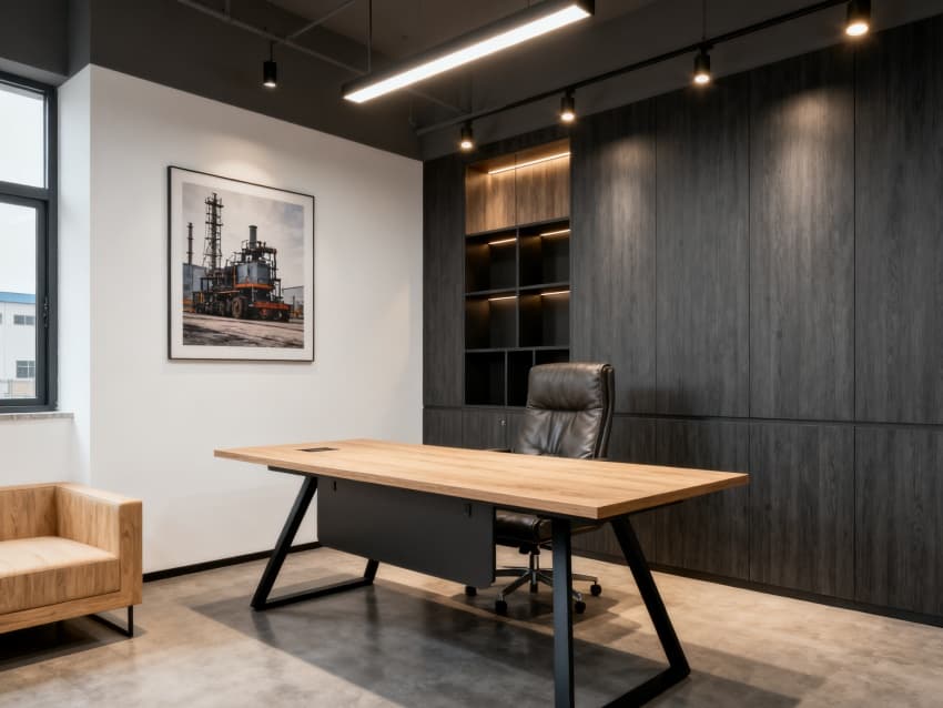 廠長(zhǎng)辦公室:整體“深灰+淺木+米白”配色,設(shè)淺木色大班臺(tái)(配黑色金屬支架)與深灰真皮辦公椅,一側(cè)墻面用米白乳膠漆(掛工業(yè)主題裝飾畫),另一側(cè)用深灰木飾面板(嵌入隱藏式儲(chǔ)物柜),靠窗設(shè)淺木色休閑沙發(fā),燈光以暖光主燈+局部射燈為主,平衡商務(wù)與舒適。