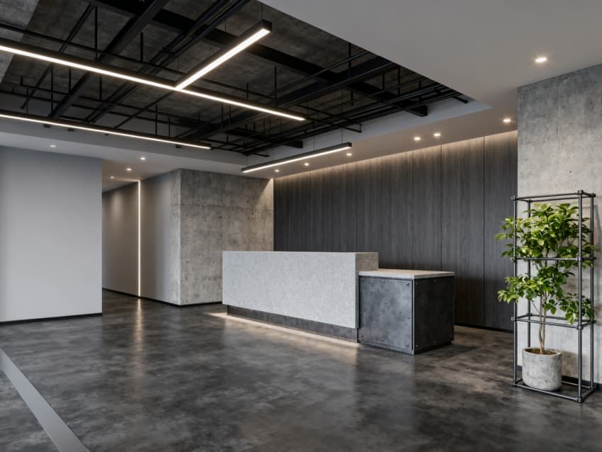 內(nèi)部大堂:地面鋪深灰水泥自流平(局部嵌淺灰金屬分隔條),墻面保留部分清水混凝土肌理,另一側(cè)用淺灰乳膠漆+深灰木飾面板,前臺(tái)為深灰鋼板柜體+淺灰人造石臺(tái)面,天花裸露黑色金屬龍骨(嵌入暖白光射燈),角落擺工業(yè)風(fēng)金屬架綠植(配水泥花盆),整體簡(jiǎn)潔大氣。
