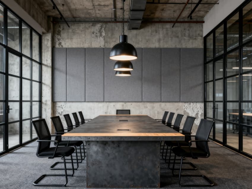 會(huì)議室:地面鋪深灰地毯,墻面貼淺灰吸音板(局部留清水混凝土肌理),會(huì)議桌為長(zhǎng)條深灰鋼板桌(配淺木色桌面),搭配黑色金屬框架會(huì)議椅,天花懸黑色金屬吊燈(暖光),兩側(cè)設(shè)黑色金屬框架玻璃隔斷,確??臻g通透且契合整體風(fēng)格。