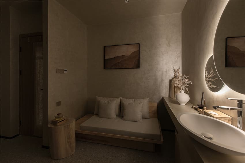 和諧統(tǒng)一的配色與細膩的材質(zhì),延伸至盥洗區(qū),集侘寂與日式元素相互融合、沉淀。設(shè)計師將護理的空間以靈韻的氣息蘊涵著美好意味,能帶客人進入一種平和的氛圍。細節(jié)上的元素同樣呼應(yīng)著我們看到的「水的波紋」,設(shè)計師讓每一個角落都可以給予客人一種熟悉感,從而卸下疲憊。