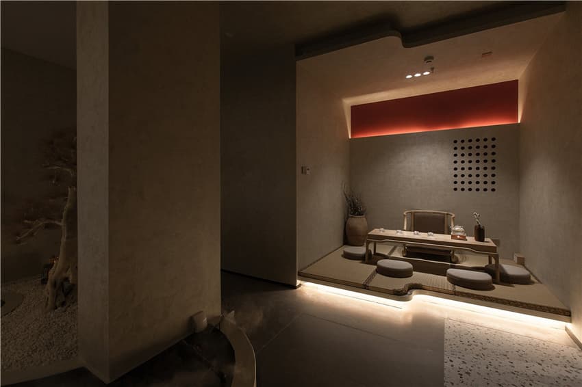 休息區(qū),水泥灰的簡練基調(diào),能讓客人感受到時間的靜謐,在短暫的停留里更有一番耐心來感受美的沉淀與力量??腿丝梢栽谶@里一邊小小地等候,一邊飲茶。茶香飄逸,能彌漫空氣當(dāng)中,散落在這個侘寂空間的每一個角落。延續(xù)了前廳的鏤空墻面設(shè)計,內(nèi)外形成空間對話,虛實結(jié)合,光影靈動,給予了客人一種仿若置身在山林間,回歸自然般的愜意。