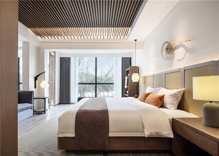 客房布草裝飾選用棉麻材質(zhì),色彩過渡柔和,給人暖意。床頭的實木雕畫回歸原野古樸,竹編吊燈造型各異,一花一草一木皆入景,簡而裁,巧而自然。竹藏風(fēng)雨,觸及野趣,山居生活隱逸悠然,靜念生長。