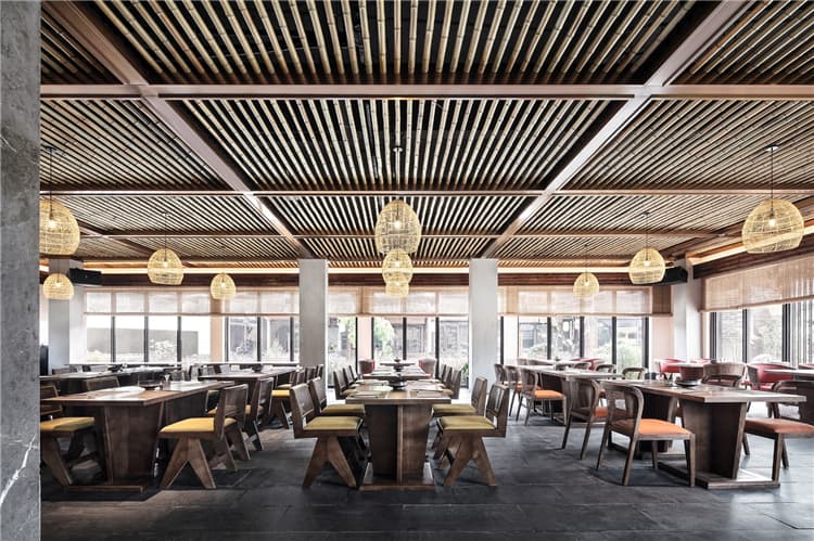九華當(dāng)?shù)囟嘀衲荆O(shè)計就地取材,空間中運用較多原木家具和竹制吊燈,及一些土陶制品,表達(dá)對本土文化的致敬和延續(xù),凈土在禪,于自然質(zhì)樸之中,斂去了浮華氣息。