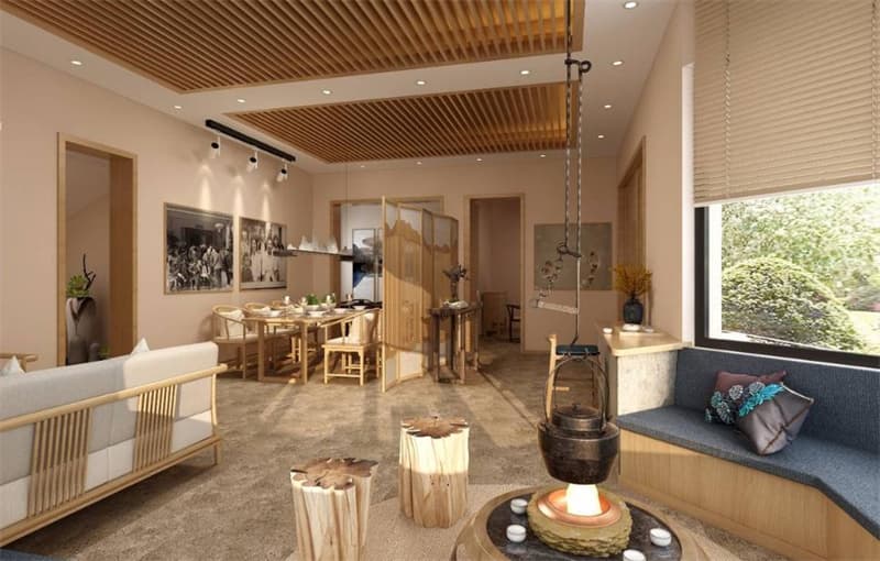 該民宿項目旨在重新定義奢華,創(chuàng)造慢節(jié)奏的空間,將室內(nèi)設計與室外景觀結(jié)合在一起。設計面臨的核心問題是如何在單一空間中創(chuàng)造的豐富有變化的尺度,從而給予民宿特別的生活體驗。首先,空間關(guān)系的再造。功能的改變帶來了空間需求的變化。原有“住”的空間不再適應民宿較高的空間使用效率和開放性需求,房間之間各自獨立的狀態(tài)急需改變,不同于日常生活的“宿”的空間需要被再造。其次,空間尺度的處理。通透的空間為尺度營造帶來了新的可能。營造一個具有尺度變化的“宿”的場所是對“身體性”的再次思考。再次,空間行為的限定。制造與日常生活相對的戲劇性要求設計進一步定義“宿”空間中人的行為,創(chuàng)造既集聚又分離的空間,幫助新的、不可預期的行為自發(fā)產(chǎn)生。