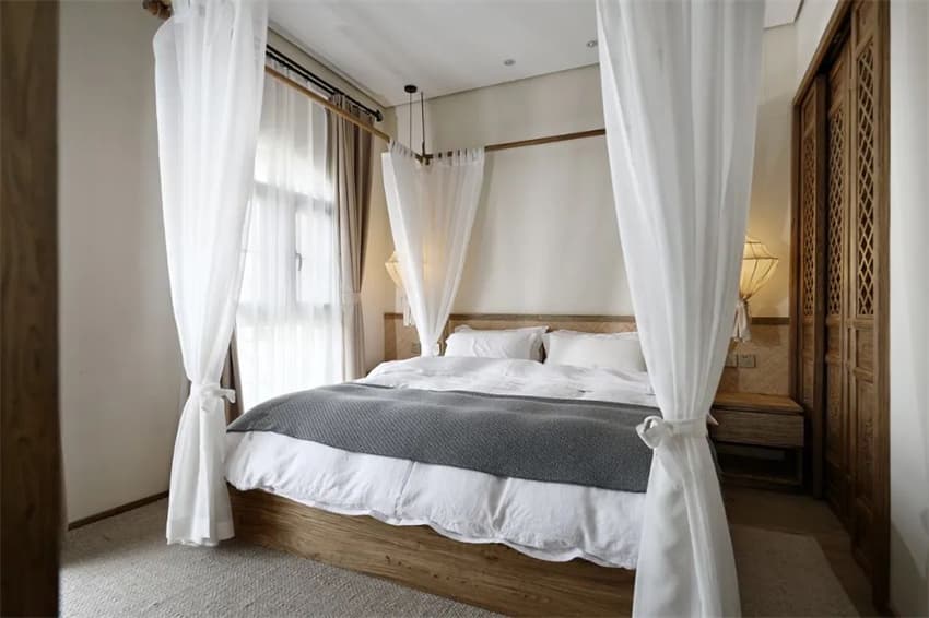 白墻外圍著一樁樁錯(cuò)落有致的木樁,簡(jiǎn)潔的白墻與自然木材的結(jié)合,為即將踏入此地的友人營(yíng)造出一種自然恬靜的感覺(jué)。地面鋪裝著的白色鵝卵石與原木色相襯,宛如森林與河流的畫(huà)卷,將自然的純凈融入之中。身在靜謐心悠遠(yuǎn),智者知隱道自然。
