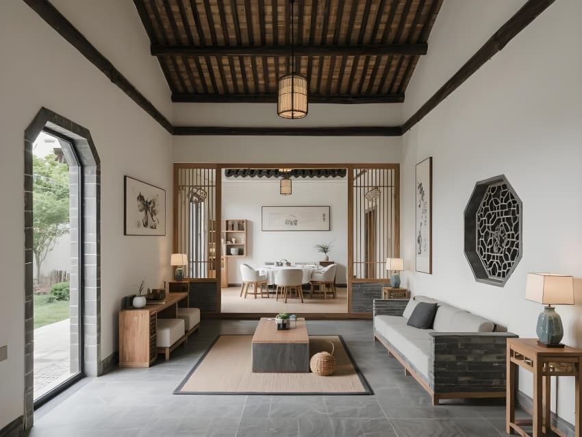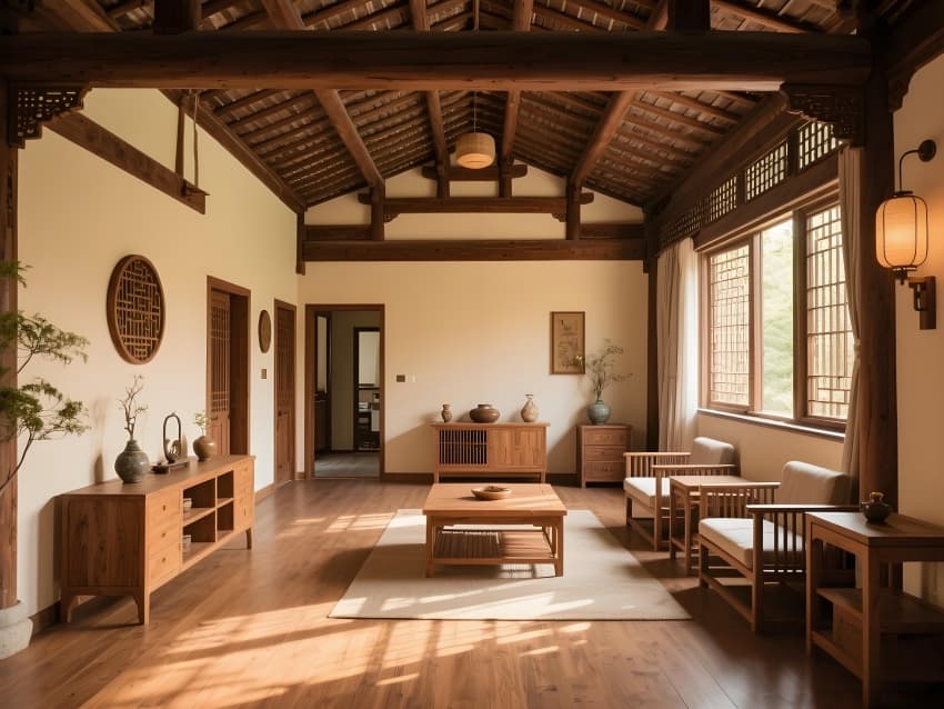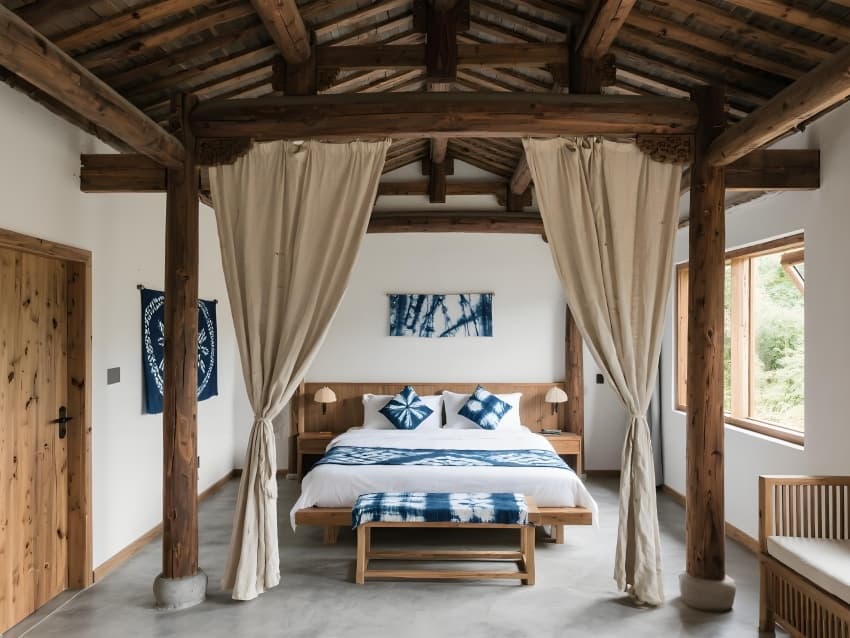 本案以"徽韻新生"為設(shè)計主線,將傳統(tǒng)村落肌理重構(gòu)為當(dāng)代避世桃源。建筑群依山就勢層疊分布,白墻黛瓦的坡屋頂與山巒輪廓呼應(yīng),門廊處的萬字紋鏤空花窗投射動態(tài)光影??头績?nèi)部采用抬梁式木構(gòu)架暴露設(shè)計,搭配亞麻帷幔與手工扎染軟裝,衛(wèi)浴區(qū)嵌入本地青石板砌筑的溫泉泡池。公共區(qū)域以"四水歸堂"天井為中心,懸浮茶亭下方流淌霧化水系,墻面裝置由村民舊農(nóng)具改造的藝術(shù)裝置。景觀設(shè)計運(yùn)用徽州"三層景"手法——前景油菜花田、中景水榭廊橋、遠(yuǎn)景黃山云海,通過智能霧森系統(tǒng)營造水墨氤氳意境,實現(xiàn)"人在畫中居"的沉浸體驗。