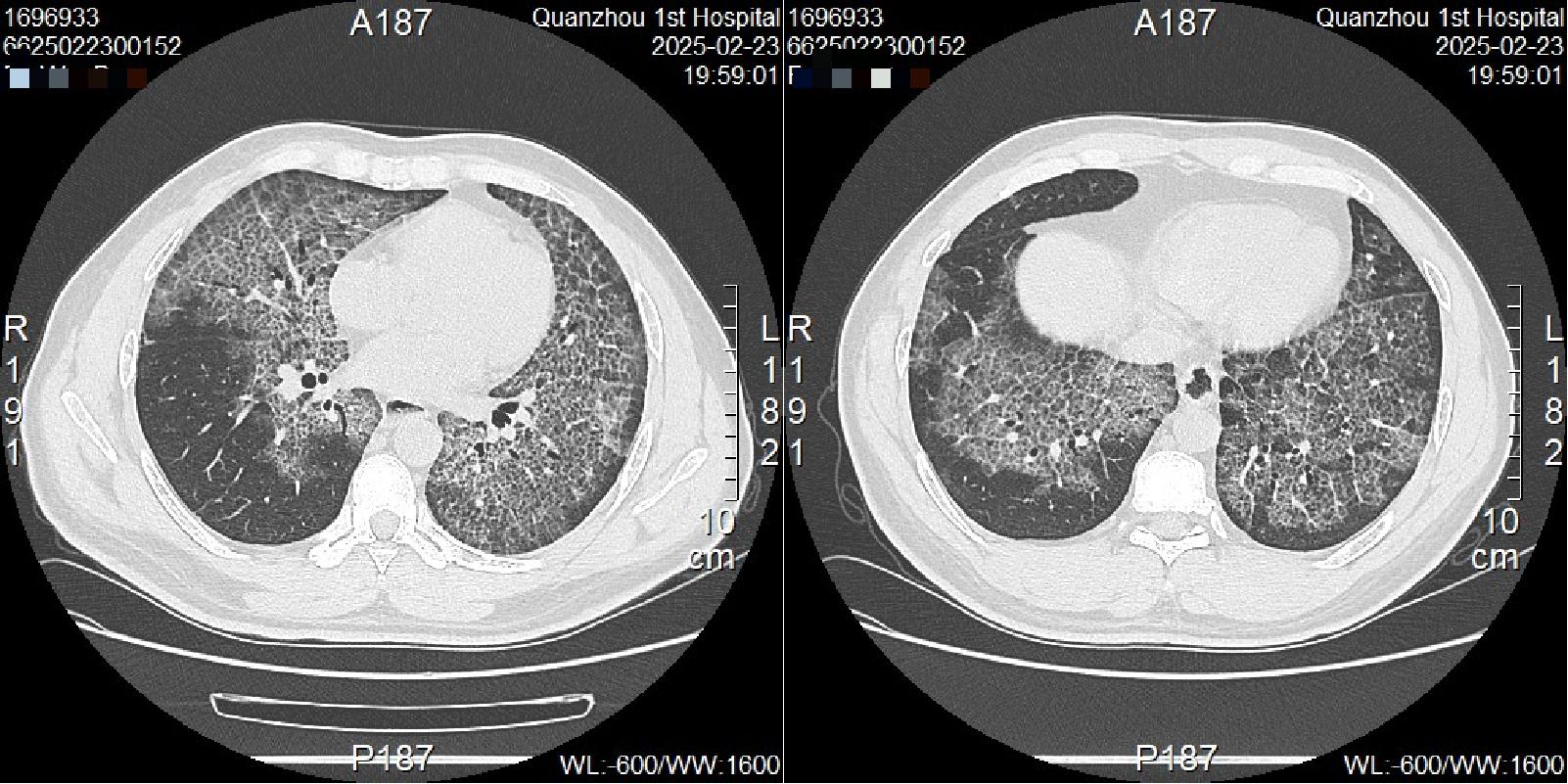 就診我院急診科行肺 CT 檢查時,發(fā)現(xiàn)肺部呈現(xiàn)彌漫白肺樣改變。經(jīng)呼吸與危重癥醫(yī)學科進一步通過支氣管鏡下肺泡灌洗及肺活檢病理、血GM-CSF抗體檢查等,傅先生最終確診為“自身免疫性肺泡蛋白沉積癥”。