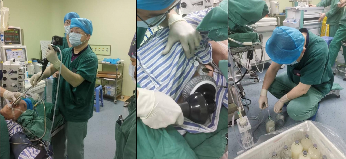 呼吸介入團隊郭偉峰主任實時調(diào)控灌洗參數(shù),應用振動排痰機增強灌洗效果,術后清除氣道內(nèi)殘余灌洗液