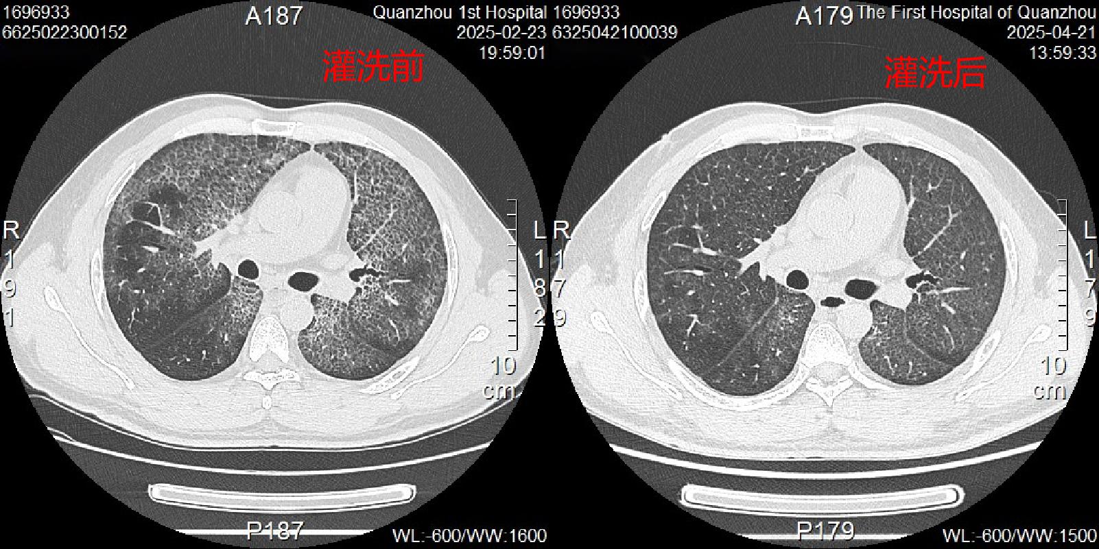 經(jīng)過雙肺分期全肺灌洗后,傅先生的呼吸困難癥狀好轉(zhuǎn),活動耐力提高,復查胸部CT顯示雙肺磨玻璃影明顯減少、肺彌散功能較前好轉(zhuǎn),順利出院。