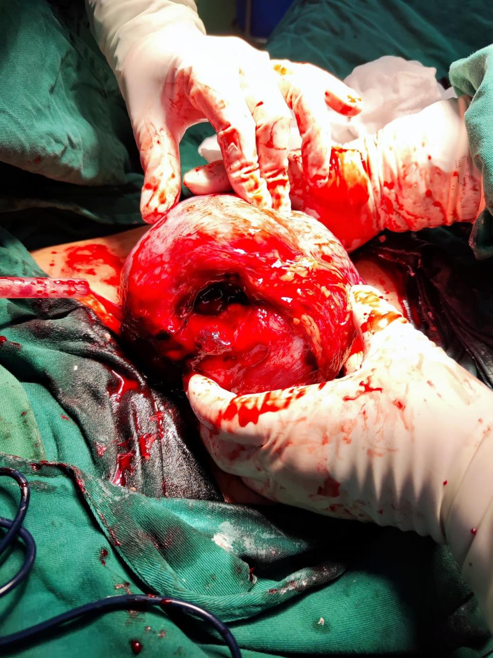 已經(jīng)做好準(zhǔn)備的醫(yī)護(hù)緊急全麻后立即剖宮產(chǎn),術(shù)中見(jiàn)血性腹水及凝血塊約800ml,娩出一評(píng)分良好活嬰,經(jīng)新生兒科醫(yī)生會(huì)診不用轉(zhuǎn)新生兒科。產(chǎn)婦這邊的手術(shù)見(jiàn)子宮前后壁大網(wǎng)膜粘連,分離粘連,見(jiàn)子宮左后壁偏宮角處一約 5×5厘米圓形破洞,貫通至子宮腔內(nèi),活動(dòng)性出血;遂清理創(chuàng)面后給予多層次的子宮修補(bǔ)。