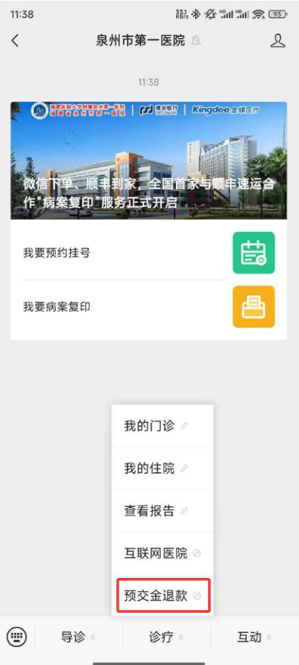 (三)1.微信搜索“泉州市第一醫(yī)院”,點(diǎn)擊“診療”,點(diǎn)擊“預(yù)交金退款”,選擇原路退回或者轉(zhuǎn)賬退,或點(diǎn)擊“導(dǎo)診”-“醫(yī)院首頁(yè)”-“預(yù)交金退款”,輕松實(shí)現(xiàn)線上辦理。
