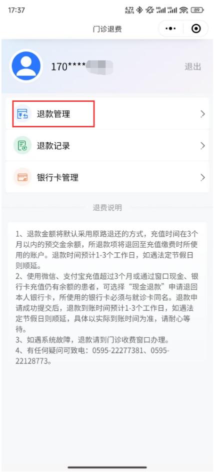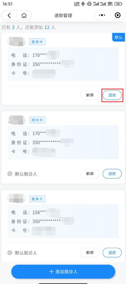 ?操作流程:從小程序首頁(yè)“退款管理”入口,已綁定就診人,直接選擇所需退款的卡,點(diǎn)擊“退款”→點(diǎn)擊“知道了”→選擇訂單點(diǎn)擊“退款”,根據(jù)提示操作確定退款,款項(xiàng)根據(jù)訂單的充值支付方式原路退回。
