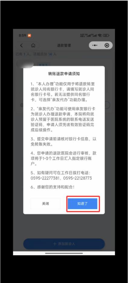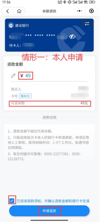2.針對(duì)無(wú)法原路退回的部分預(yù)交金余額,選擇“本人申請(qǐng)”或“親友申請(qǐng)”后,通過點(diǎn)擊“申請(qǐng)現(xiàn)金退款”→點(diǎn)擊“選擇銀行卡”填寫銀行卡信息→點(diǎn)擊“確定”→點(diǎn)擊“選擇”→閱讀退款須知后點(diǎn)擊“申請(qǐng)退款”。