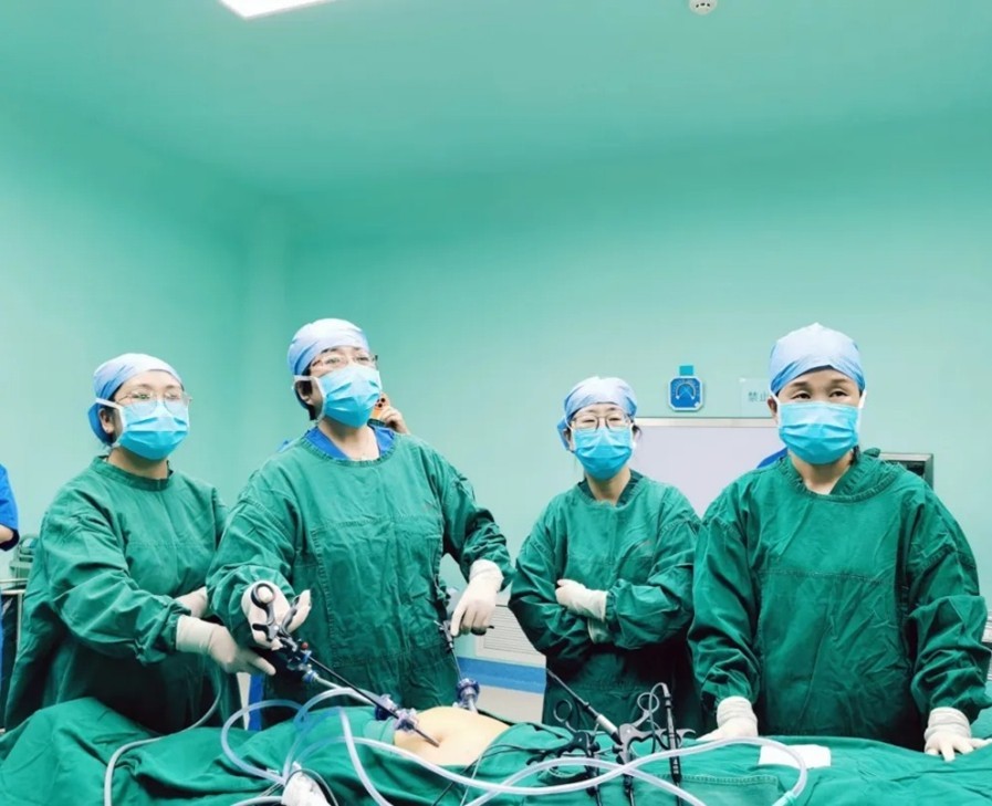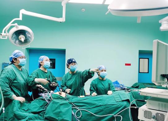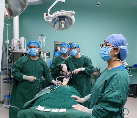 鄭志華醫(yī)師(左二)在行單孔腹腔鏡闌尾腫瘤切除手術(shù)