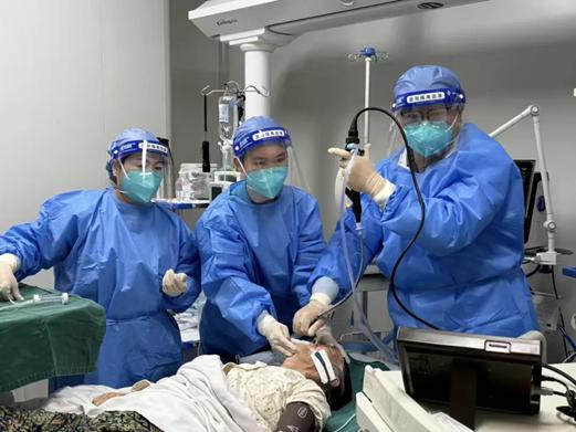 黃建輝醫(yī)師(右一)在同心縣人民醫(yī)院ICU進行纖維支氣管鏡肺泡灌洗示教