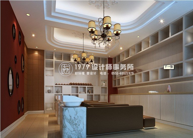 3、發(fā)廊洗頭區(qū)設計:沖水區(qū)應以干凈明快為主題來設計,墻面用噴漆玻璃來做裝飾,讓顧客對本店感受到潔凈的形象。