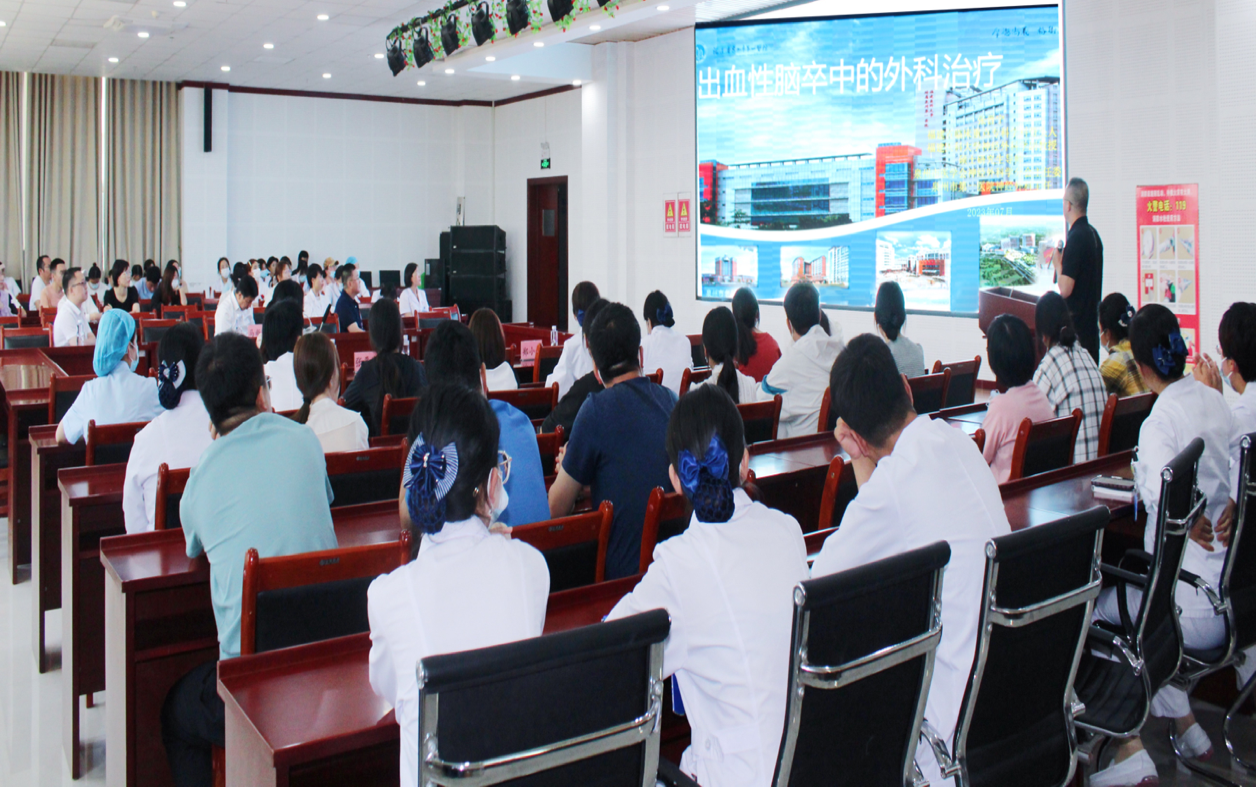 交流期間,張晉寧主任在同心縣人民醫(yī)院學術廳向同心縣人民醫(yī)院的相關專業(yè)醫(yī)務人員分享了《出血性腦卒中的外科治療》的專題講座,介紹了出血性腦卒中外科治療的指征及方式,包括骨瓣開顱血腫清除術、小骨窗開顱血腫清除術、內鏡下血腫清除術、硬通道錐顱穿刺血腫清除術、定向穿刺置管血腫吸引術以及復合手術室對于復雜腦血管病的治療作用。