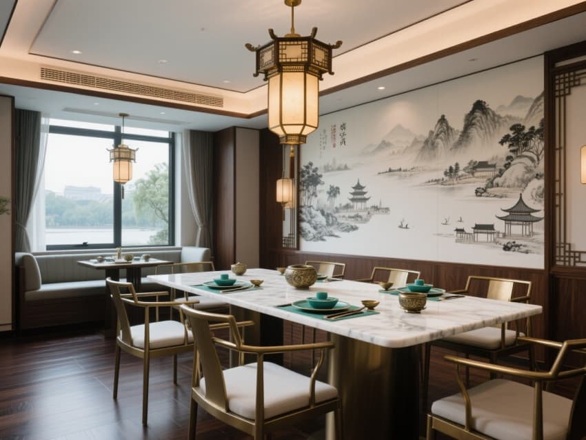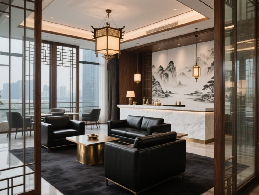 餐飲空間雅致考究,中式宮燈搭配水墨山水壁畫,大理石餐桌與金屬質(zhì)感座椅營(yíng)造出輕奢用餐氛圍,窗外景致與室內(nèi)格調(diào)相映成趣。客房采用黑紅金經(jīng)典配色,實(shí)木雕花、云紋大理石背景墻盡顯中式雍容,超大落地窗將城市夜景引入室內(nèi),配套的青瓷擺件更添文化韻味。