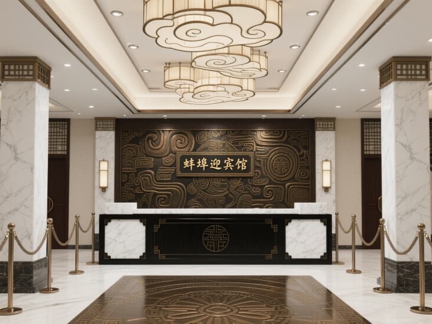 該蚌埠酒店是一座將新中式典雅與現(xiàn)代奢華完美融合的高端酒店。大堂以大理石立柱、祥云造型吊燈與銅制浮雕背景墻構(gòu)成恢宏氣場(chǎng),“蚌埠迎賓館”的牌匾盡顯地域文化底蘊(yùn)。