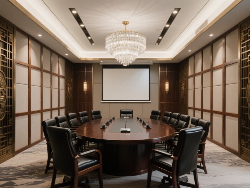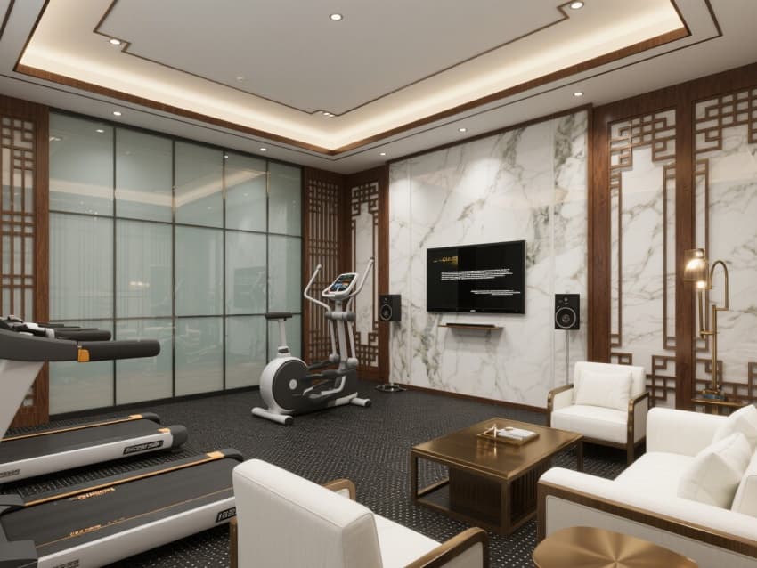 會(huì)議室兼具商務(wù)與典雅,水晶吊燈與中式格柵設(shè)計(jì)碰撞出獨(dú)特質(zhì)感,高端設(shè)備滿足各類會(huì)議需求。休閑區(qū)域同樣用心,健身房的現(xiàn)代器械與新中式軟裝和諧共存,lounge區(qū)的皮革沙發(fā)、山水壁畫與城市景觀窗,為賓客打造出休憩洽談的雅致空間。整體設(shè)計(jì)將蚌埠的人文底蘊(yùn)與現(xiàn)代酒店的舒適奢華精妙結(jié)合,是商務(wù)接待、休閑旅居的理想之選。