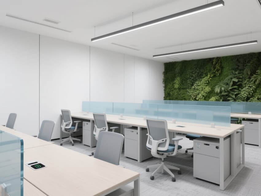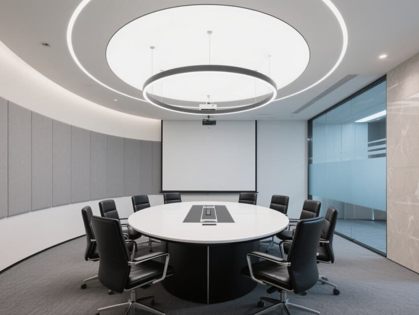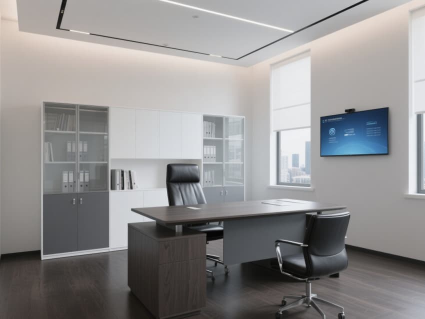 開(kāi)放式辦公區(qū)采用懸浮式模塊化工位,桌面嵌入隱藏式智能插座與無(wú)線充電板,天花懸掛可自動(dòng)調(diào)節(jié)亮度的線性燈帶;會(huì)議室以雙層隔音玻璃圍合,墻面配備一體化觸控電子屏與遠(yuǎn)程會(huì)議攝像頭,地面鋪設(shè)防靜電靜音地毯。接待區(qū)設(shè)置極簡(jiǎn)造型的皮質(zhì)沙發(fā)與金屬框架茶幾,背景墻用霧面玻璃疊加動(dòng)態(tài)品牌LOGO投影,科技感與簡(jiǎn)約感兼具。?