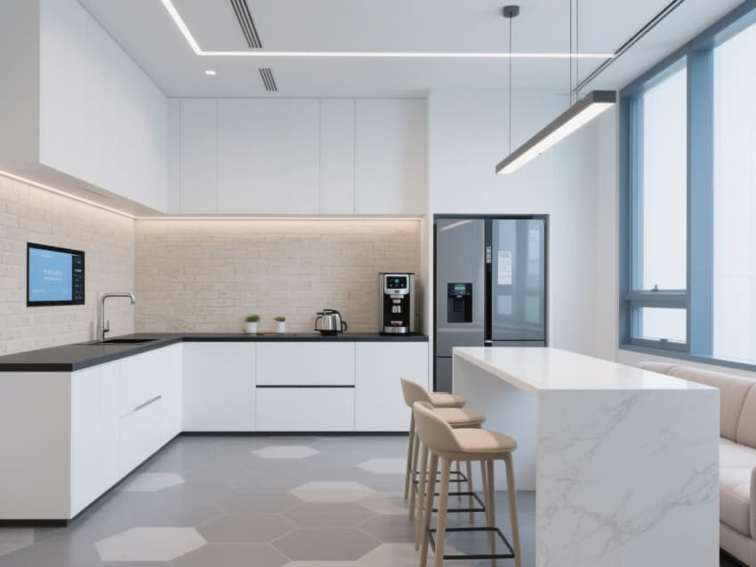 各區(qū)域通過(guò)統(tǒng)一的隱形收邊工藝與智能中控系統(tǒng)串聯(lián),茶水間采用抗菌石英石臺(tái)面與感應(yīng)式水龍頭,走廊嵌入發(fā)光導(dǎo)視牌與環(huán)境監(jiān)測(cè)顯示屏。既滿足辦公功能需求,又以極簡(jiǎn)設(shè)計(jì)減少視覺(jué)干擾,用智能元素提升辦公效率,打造出適配現(xiàn)代企業(yè)的高效智能辦公場(chǎng)景。