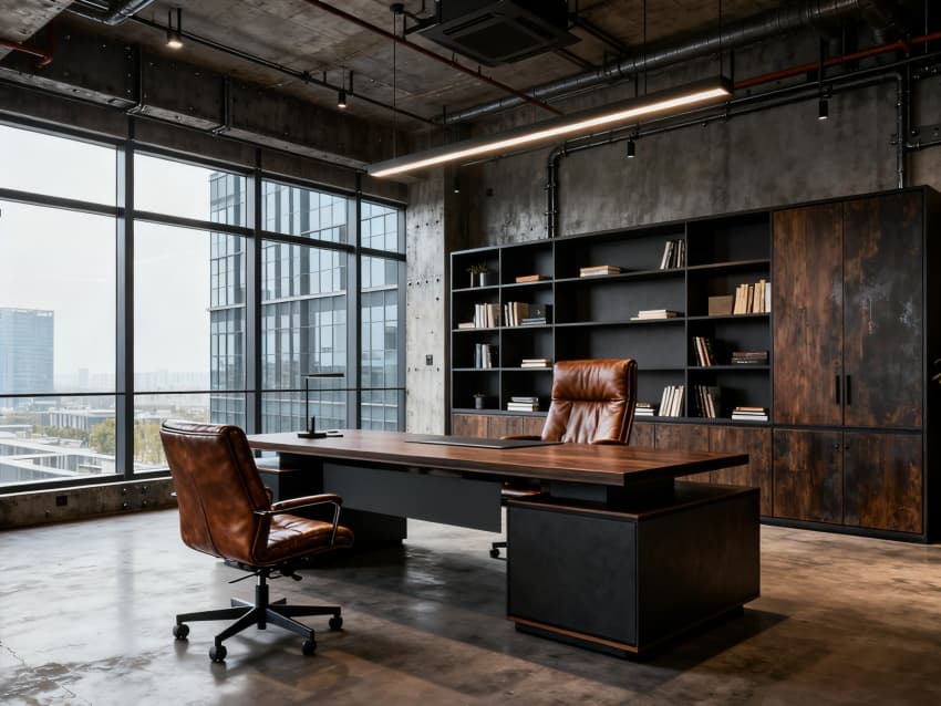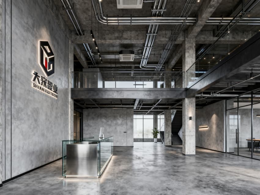 辦公區(qū)以淺灰地磚搭配白色墻面,黑色金屬辦公家具與裸露管線呼應(yīng),營造干練氛圍;會議室用深色木質(zhì)桌面搭配灰色布藝座椅,玻璃隔斷保證通透;休息區(qū)加入淺黃軟裝點(diǎn)綴,平衡工業(yè)冷感;走廊用線性燈與金屬扶手結(jié)合,增強(qiáng)空間縱深感;設(shè)備區(qū)則以實(shí)用為主,灰色儲物柜與淺色墻面搭配,整潔有序。整體通過材質(zhì)、色彩統(tǒng)一,打造出兼具工業(yè)特質(zhì)與舒適感的空間。