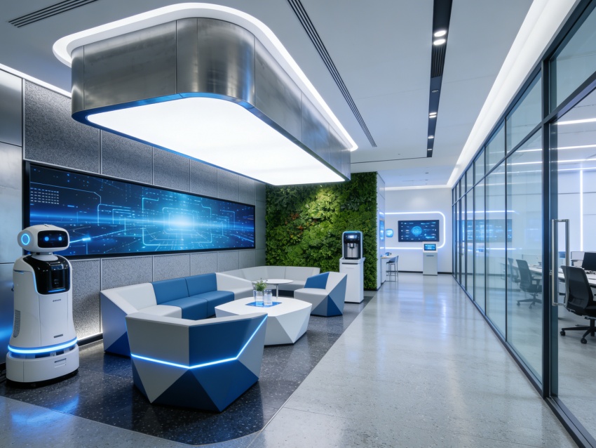 整體以深空灰、科技藍(lán)為主色調(diào),搭配淺灰基底中和視覺,材質(zhì)選用防靜電地板、隔音環(huán)保板材及磨砂玻璃。墻面局部嵌入簡(jiǎn)約AI元素裝飾與數(shù)據(jù)可視化線條,燈光采用分層智能照明,兼顧專注辦公與氛圍營(yíng)造。各空間通過通透隔斷自然銜接,動(dòng)線流暢,既保障研發(fā)工作的私密性與專業(yè)性,又強(qiáng)化團(tuán)隊(duì)協(xié)作便利性,實(shí)現(xiàn)科技美學(xué)與研發(fā)功能的深度融合。