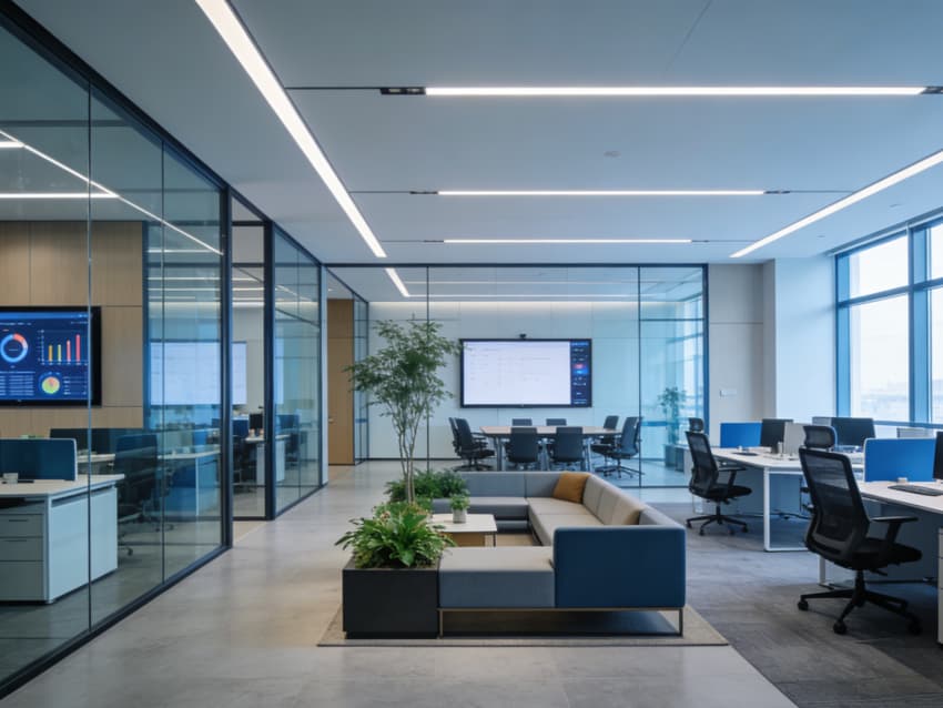 整體空間采用極簡現(xiàn)代風(fēng)格,以黑白灰為基底,搭配淺木色與科技藍(lán)作為點綴,營造出理性、高效的科研氛圍。開放辦公區(qū)采用模塊化工位布局,搭配人體工學(xué)座椅與雙屏顯示器,滿足研發(fā)人員長時間專注工作的需求;頂面線性燈帶與嵌入式筒燈形成層次分明的照明系統(tǒng),既保障工作照度,又通過無主燈設(shè)計強(qiáng)化空間的縱深感。