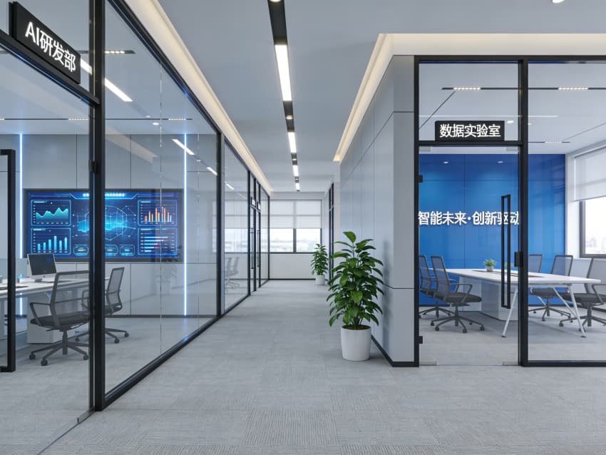 功能分區(qū)清晰明確:“AI 研發(fā)中心” 主工區(qū)配備多塊數(shù)據(jù)可視化大屏,實時展示算法模型與訓(xùn)練成果;玻璃隔斷劃分出 “AI 創(chuàng)新實驗室” 與 “數(shù)據(jù)實驗室”,既保障研發(fā)項目的保密性,又通過通透材質(zhì)維持空間的開放感;休閑洽談區(qū)以淺灰沙發(fā)、原木茶幾搭配綠植,為團(tuán)隊頭腦風(fēng)暴與技術(shù)交流提供輕松的場景,水吧區(qū)則配備咖啡機(jī)與儲物格,滿足日常能量補(bǔ)給需求。