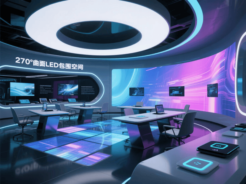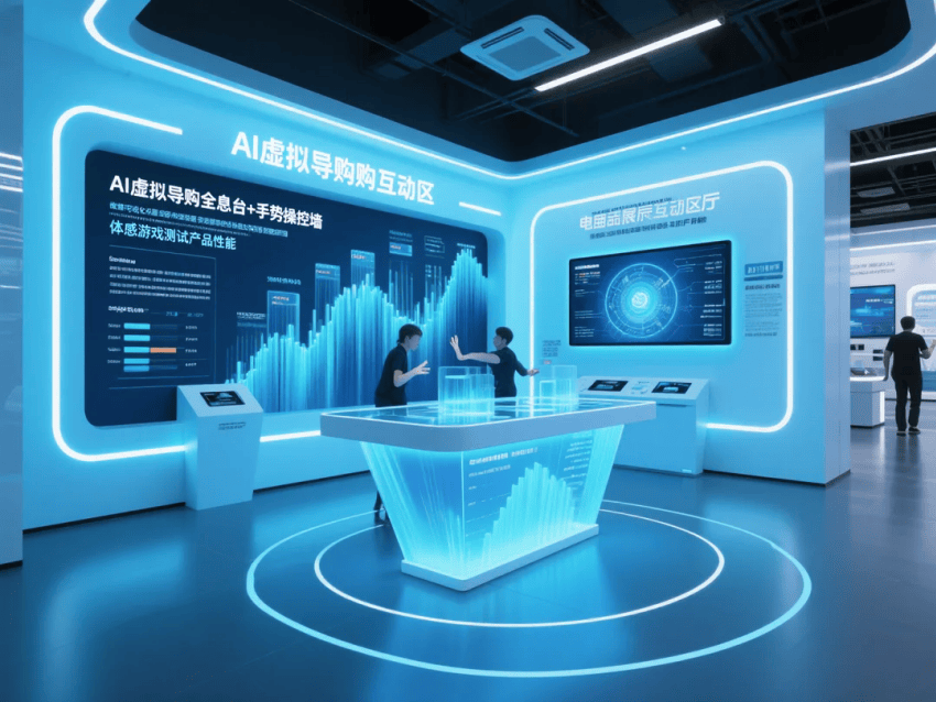 展廳以"數(shù)字共生·未來(lái)觸感"為主題,采用賽博朋克與極簡(jiǎn)主義的融合風(fēng)格。主色調(diào)選用科技藍(lán)、星際銀與暗夜黑,局部點(diǎn)綴霓虹粉與熒光綠增強(qiáng)視覺(jué)沖擊??臻g運(yùn)用流線型架構(gòu)與幾何切割形成對(duì)比,材質(zhì)上結(jié)合啞光金屬、霧面玻璃與全息膜營(yíng)造層次感。燈光系統(tǒng)采用隱藏式線性光帶與智能點(diǎn)陣光源,實(shí)現(xiàn)動(dòng)態(tài)氛圍切換。數(shù)字化交互貫穿全場(chǎng),通過(guò)AR增強(qiáng)現(xiàn)實(shí)、體感捕捉等技術(shù)強(qiáng)化體驗(yàn)沉浸感,同時(shí)保留充足的留白區(qū)域平衡科技張力。設(shè)計(jì)強(qiáng)調(diào)"人-機(jī)-環(huán)境"的三維互動(dòng),以未來(lái)感為核心卻不失人文溫度,最終呈現(xiàn)一個(gè)兼具先鋒性與功能性的電子科技展示空間。