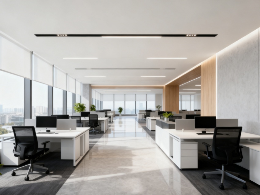 內(nèi)部空間遵循“功能優(yōu)先、分區(qū)清晰”原則,科學(xué)規(guī)劃開放辦公區(qū)、獨立辦公室、會議中心、休閑洽談區(qū)及配套服務(wù)區(qū)。開放辦公區(qū)采用模塊化布局,預(yù)留靈活拓展空間,滿足多人協(xié)作需求;獨立辦公室沿采光面排布,保障私密辦公體驗;會議中心配備智能影音系統(tǒng),適配不同規(guī)模會議場景;休閑區(qū)融入柔和軟裝與綠植,緩解辦公壓力。?