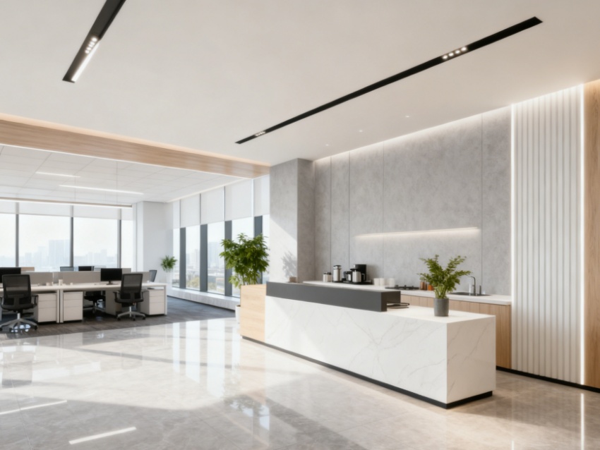 本4300㎡寫字樓設(shè)計以“現(xiàn)代簡約?高效通透”為核心,實現(xiàn)外立面與內(nèi)部空間的風(fēng)格統(tǒng)一與功能適配。外立面采用玻璃幕墻與淺灰色金屬線條結(jié)合,搭配大面積采光面,既彰顯商務(wù)質(zhì)感,又最大化引入自然光線,呼應(yīng)內(nèi)部通透設(shè)計理念。?