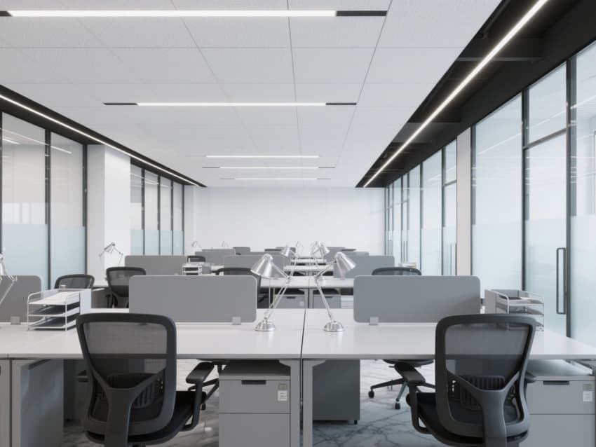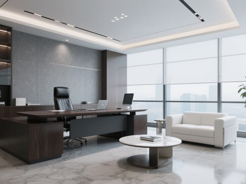 •     以現(xiàn)代簡約與商務(wù)科技感融合為核心風(fēng)格,構(gòu)建出統(tǒng)一專業(yè)、高效的辦公空間體系。整體以純凈白與高級灰為基底,點(diǎn)綴低飽和商務(wù)藍(lán),通過利落直線條與通透玻璃隔斷,弱化空間邊界,營造開闊明亮的視覺感受。?