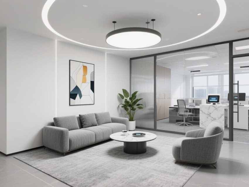 開放式辦公區(qū)采用模塊化工位,桌面嵌入無線充電模塊,天花懸掛線性智能燈帶,可隨場景調(diào)節(jié)亮度;會議室以雙層中空玻璃圍合,墻面配備一體化電子屏與遠(yuǎn)程協(xié)作設(shè)備,地面鋪設(shè)防靜電耐磨地毯。接待區(qū)設(shè)置弧形皮質(zhì)沙發(fā)與金屬框架茶幾,背景墻用漸變玻璃疊加企業(yè)LOGO投影,科技感與商務(wù)感兼具。?