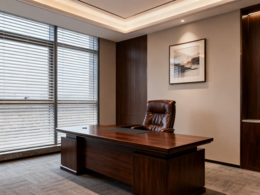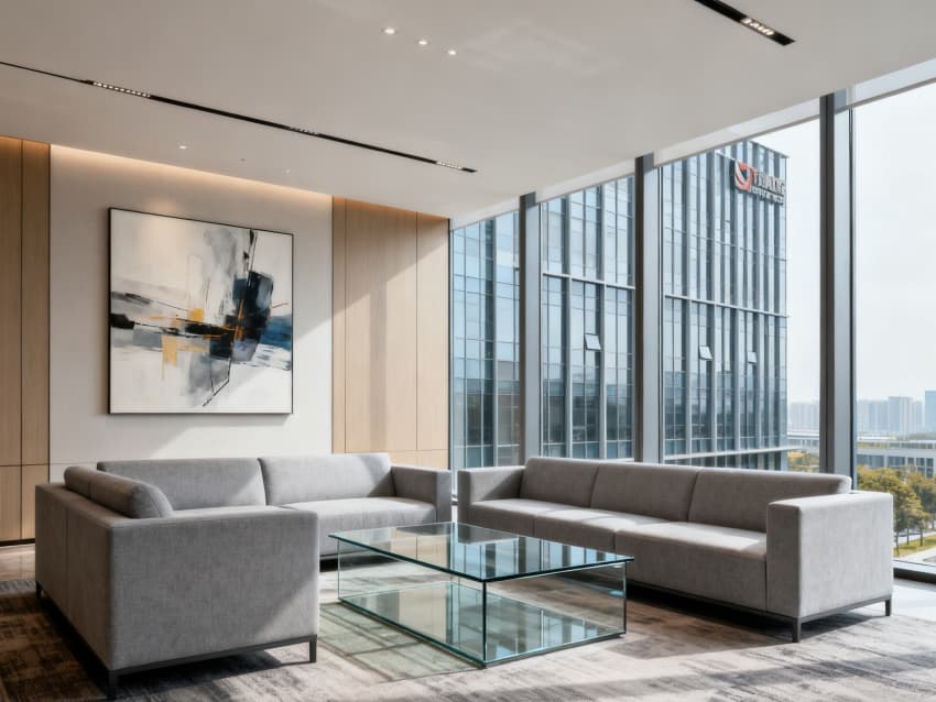 內(nèi)部設(shè)計(jì)聚焦“功能適配與空間利用率”:核心辦公區(qū)為主體,采用模塊化工位布局,淺灰防靜電地板搭配白色吸音吊頂,淺木色矮隔斷劃分部門(mén)區(qū)域,既保障團(tuán)隊(duì)協(xié)作,又避免空間壓抑;獨(dú)立辦公區(qū)分布于空間兩側(cè),玻璃隔斷+百葉簾設(shè)計(jì)兼顧采光與隱私,適配管理崗及獨(dú)立部門(mén)需求;公共接待區(qū)位于入口核心區(qū),懸浮式淺灰烤漆前臺(tái)搭配質(zhì)感沙發(fā),背景墻嵌入企業(yè)LOGO展示區(qū),傳遞專(zhuān)業(yè)第一印象;輔助配套區(qū)含3間會(huì)議室(8人研討、15人會(huì)議、30人大型會(huì)議)、茶水間、文件庫(kù)房與休閑角,會(huì)議室配備智能投屏與聲學(xué)優(yōu)化設(shè)計(jì),茶水間設(shè)開(kāi)放式操作臺(tái)與儲(chǔ)物區(qū),休閑角搭配綠植與舒適座椅,為員工提供放松空間。?