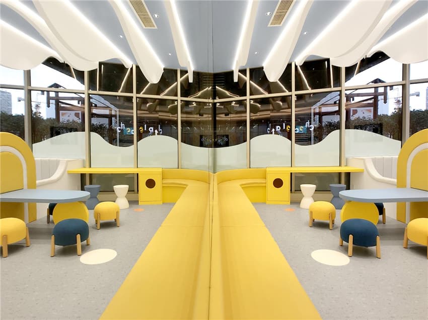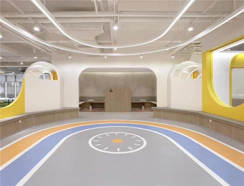 利用樓宇的縱向夾角空間,層層疊出的形象是進(jìn)入星球的能量加速器。地上的黃色跑道是孩子們丈量自己成長(zhǎng)的T臺(tái),每個(gè)小朋友通過(guò)跑道后都擁有更強(qiáng)的生命力。緊鄰接待區(qū)的泡泡池是迎接孩子們的歡樂(lè)地,背后的鏡面構(gòu)筑了游離在現(xiàn)實(shí)與夢(mèng)境之間的界限,折射出孩子更加廣闊的天空,讓能量加倍!