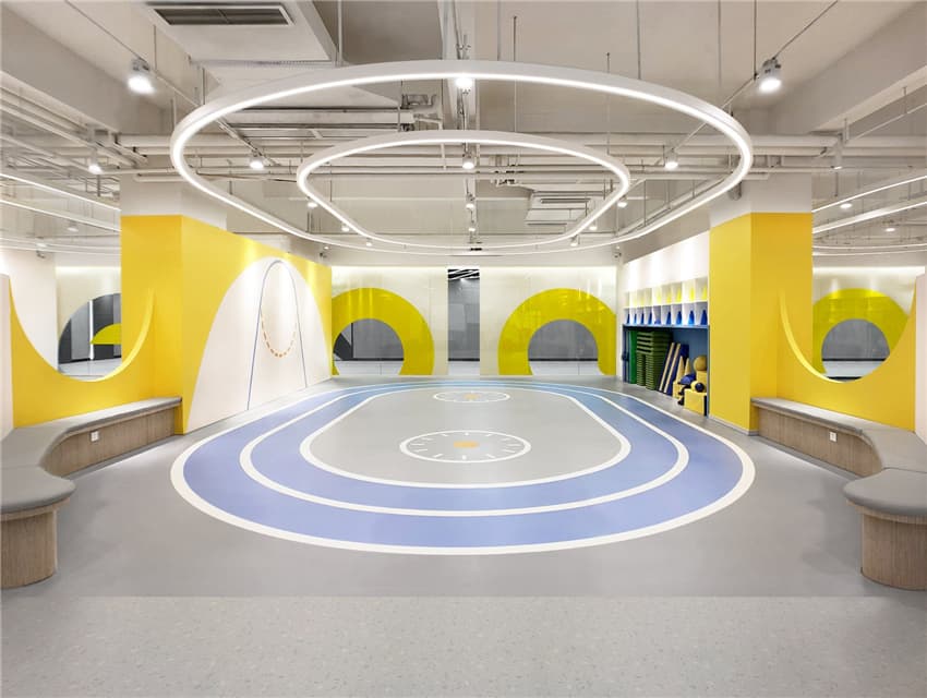 陽(yáng)光洗禮這片綠茵,賦予茁壯的祝福。空間抹去一堵墻體,消弭了教室的結(jié)構(gòu),其功能得到了重塑,給組合課堂提供支持。地面的跑道被星球的神奇能量映射在空中,下一秒的跳躍,也許能乘駕著時(shí)間,奔跑向星辰和大海。每一個(gè)教室的教具都被用心安放,留給孩子們足夠的空間揮灑自由。柱間尺度的限制下我們轉(zhuǎn)換了家長(zhǎng)的看課方式,親子間共同的成長(zhǎng)是我們對(duì)場(chǎng)所的思考。