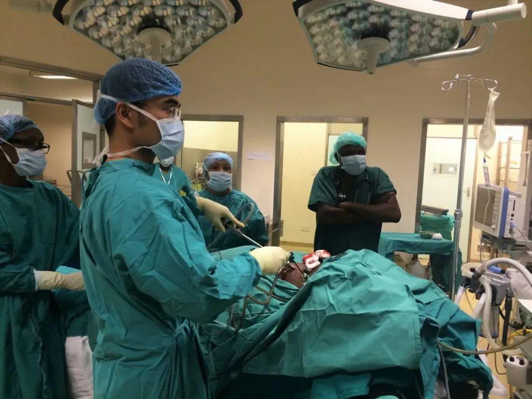 不僅如此,他們還利用僅有條件開(kāi)展實(shí)用技術(shù),實(shí)現(xiàn)了胸腔鏡手術(shù)、神經(jīng)外科手術(shù)等多項(xiàng)零的突破。陳?ài)抠s率先開(kāi)展了公主瑪麗娜醫(yī)院的第一例胸腔鏡手術(shù),因?yàn)槿狈ο鄳?yīng)器械,他就用腹腔鏡的手術(shù)器械代替,結(jié)果手術(shù)大獲成功。同批到來(lái)的同事李謀儀兩年時(shí)間里,成功完成近400臺(tái)顯微手術(shù),其中如四腦室室管膜瘤切除術(shù)、枕骨大孔區(qū)囊腫切除術(shù)、巨大嗅溝腦膜瘤切除術(shù)等都是博國(guó)第一次開(kāi)展的。