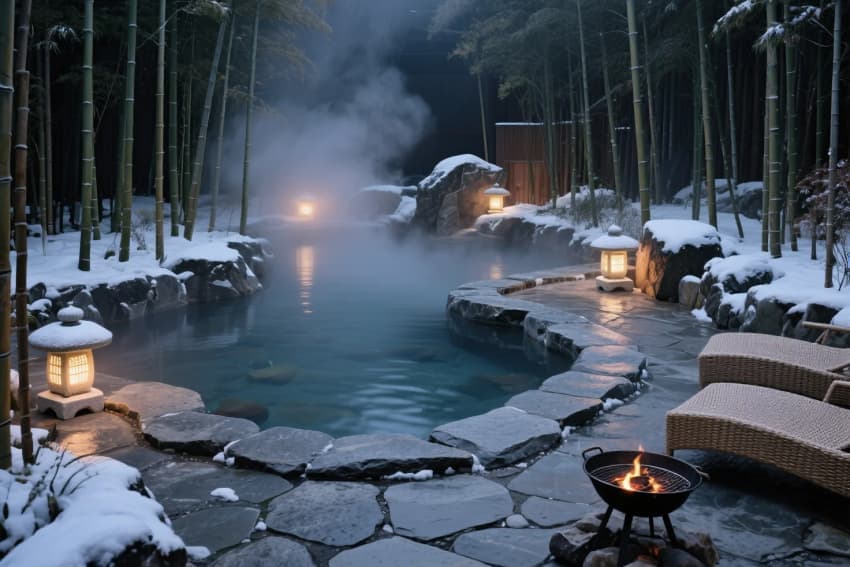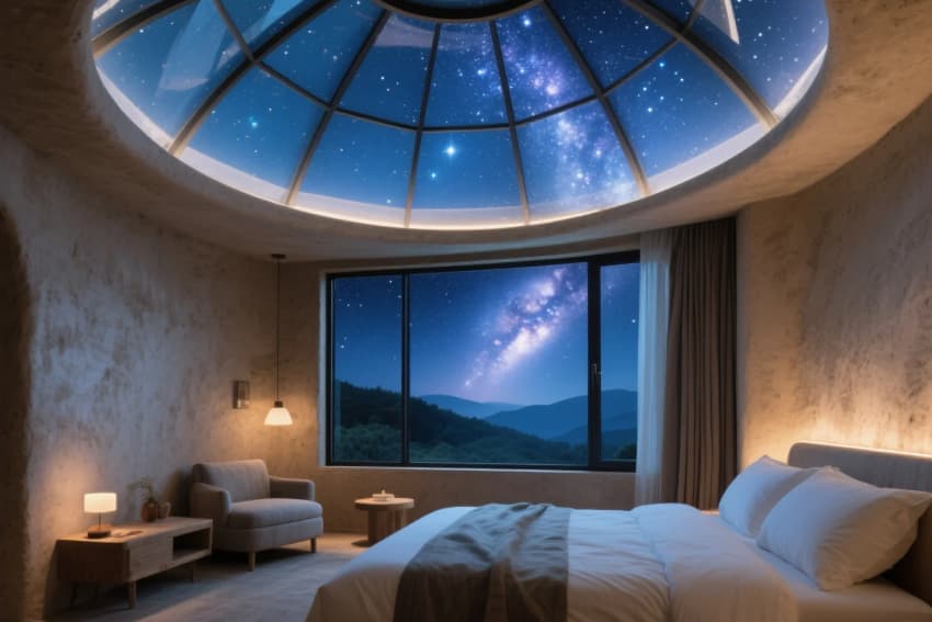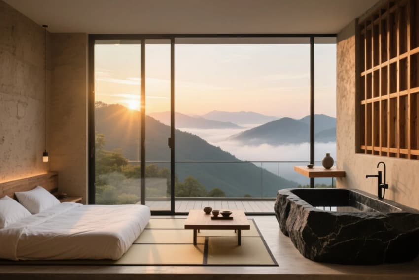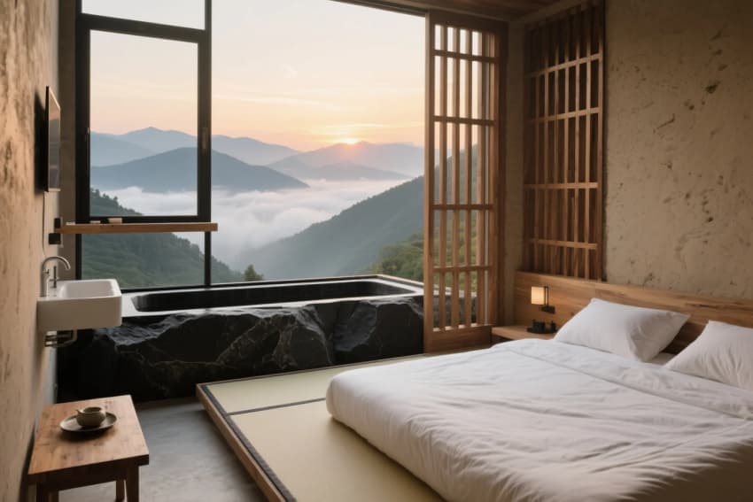 設(shè)計(jì)以"自然共生、質(zhì)樸療愈"為核心理念,打造隱逸于山林的靜謐居所。建筑采用夯土墻與原木結(jié)構(gòu)的在地化語(yǔ)言,錯(cuò)落式布局順應(yīng)山地地形。公區(qū)以懸挑茶室與枯山水庭院為核心,客房通過(guò)全景落地窗將四季山景引入室內(nèi)。材質(zhì)上強(qiáng)調(diào)手工質(zhì)感——老榆木梁柱、手工陶磚、亞麻簾幕,搭配地暖榻榻米與露天湯池。路徑設(shè)計(jì)蜿蜒曲折,石階兩側(cè)點(diǎn)綴苔蘚與石燈籠,夜間呈現(xiàn)"螢火蟲(chóng)小徑"的夢(mèng)幻效果。整體以不完美的自然肌理詮釋"寂之美",構(gòu)建可居可游的詩(shī)意棲居。