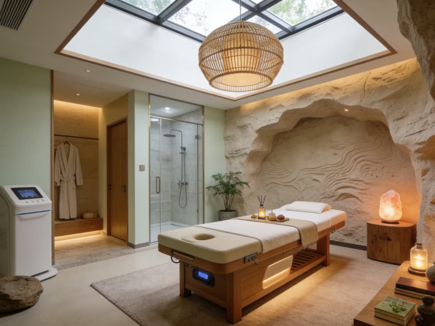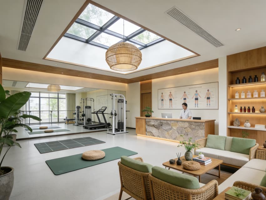 內(nèi)部功能分區(qū)科學(xué)適配康養(yǎng)需求,涵蓋康養(yǎng)接待區(qū)、理療康養(yǎng)區(qū)、景觀客房區(qū)、營養(yǎng)膳食餐廳、休閑冥想?yún)^(qū)及戶外露臺康養(yǎng)區(qū)。理療區(qū)配備專業(yè)康養(yǎng)設(shè)備,采用通透隔斷保障隱私的同時引入自然采光;客房以全景落地窗銜接景觀庭院,配備助眠床墊與香薰系統(tǒng);冥想?yún)^(qū)打造靜謐氛圍,搭配綠植景觀與柔和音效助賓客舒緩身心。