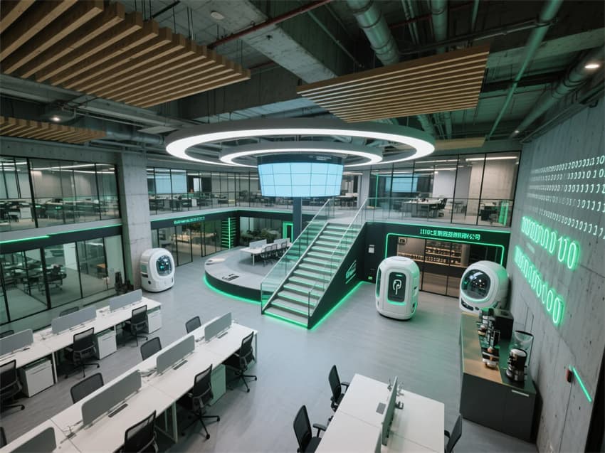 • 該辦公空間以“未來(lái)感+極簡(jiǎn)工業(yè)風(fēng)”為基調(diào)。開放式布局搭配通透的玻璃隔斷,保留原始混凝土天花與管線,穿插暖木色格柵中和冷硬感。核心區(qū)設(shè)置階梯式共享中庭,嵌入環(huán)形LED屏與智能照明系統(tǒng)。工位區(qū)采用模塊化升降桌,點(diǎn)綴太空艙式電話亭與熒光綠科技線條。茶水區(qū)打造賽博朋克風(fēng)咖啡吧,裸露的金屬框架與霓虹燈管碰撞,墻面裝飾二進(jìn)制代碼藝術(shù)裝置,整體營(yíng)造激發(fā)創(chuàng)意的數(shù)字美學(xué)空間。